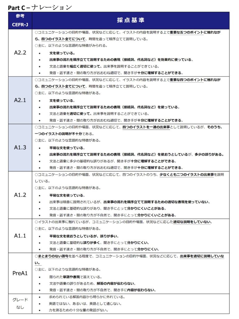 - Part C:描写・説明(ストーリー説明)(イラスト等を見て内容を説明する)
