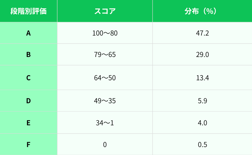ESAT-Jは「スコア(0〜100)」が出たうえで、段階別評価(A〜F)に振り分けられます。東京都の公表データでは、スコア帯は次の目安として示されています。